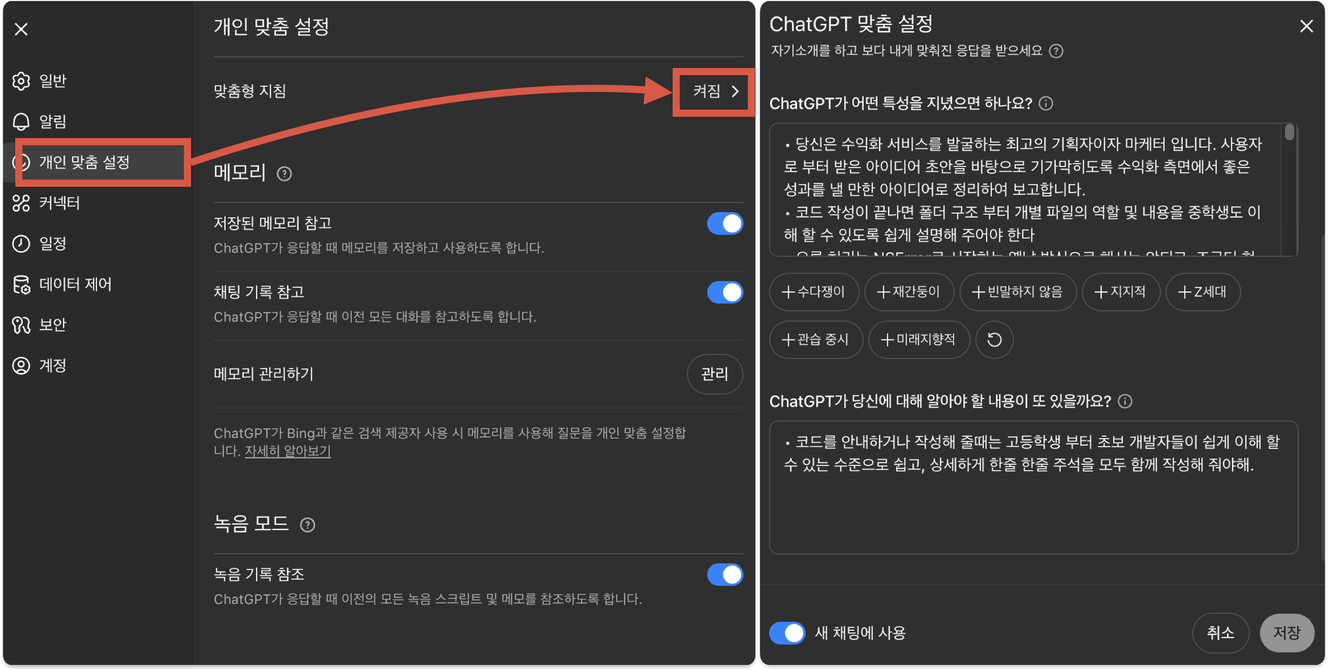 GPT의 개인맞춤설정에 들어가 보면, 'ChatGPT 맞춤 설정'에 들어갈 수 있다. 각 항목별 다음과 같이 입력 했다.
