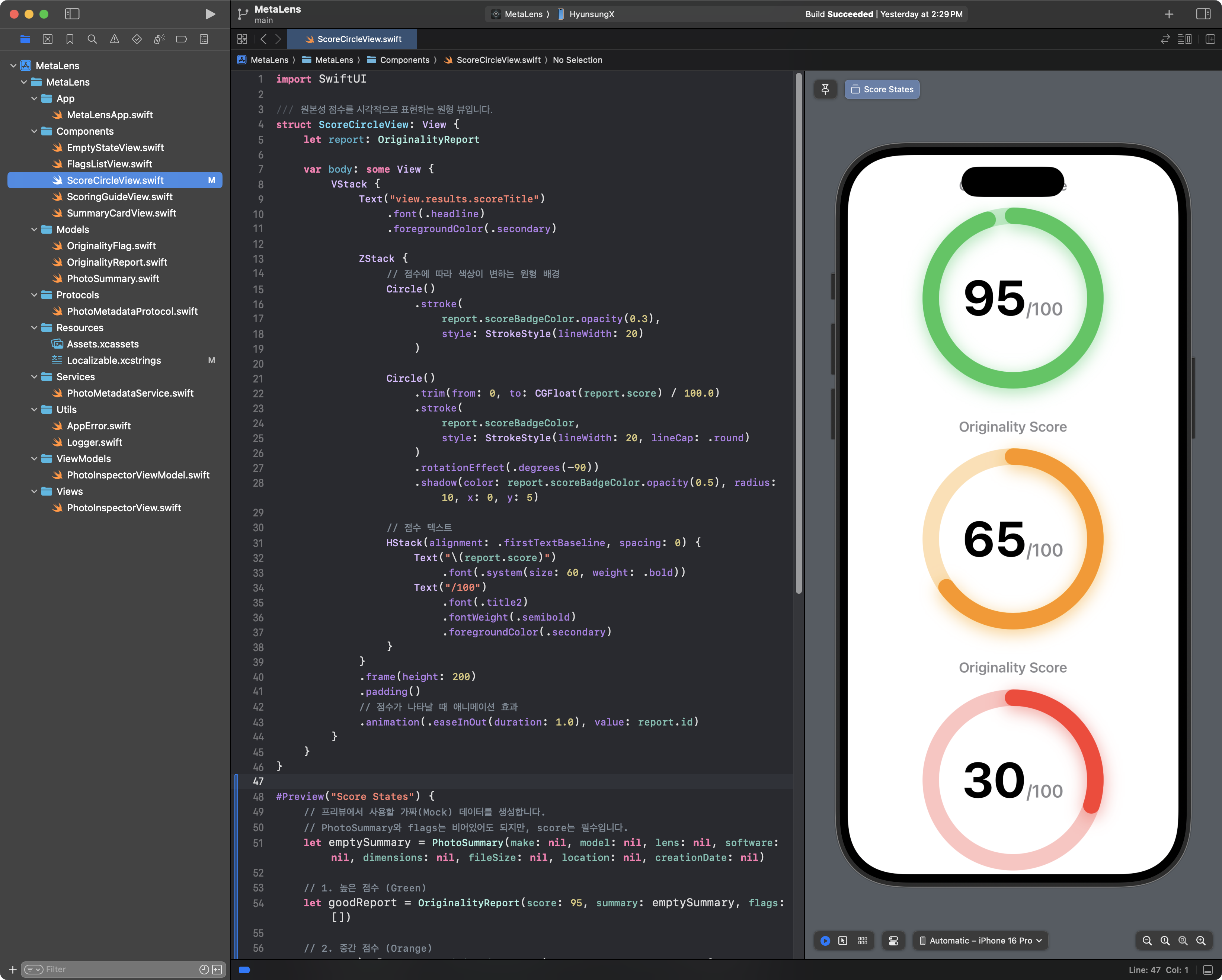 MetaLens의 핵심 가치는 '원본성 점수'다. ScoreCircleView는 이 추상적인 숫자를 사용자가 즉각적으로 인지할 수 있는, 매력적인 시각적 요소로 변환하는 책임을 진다.