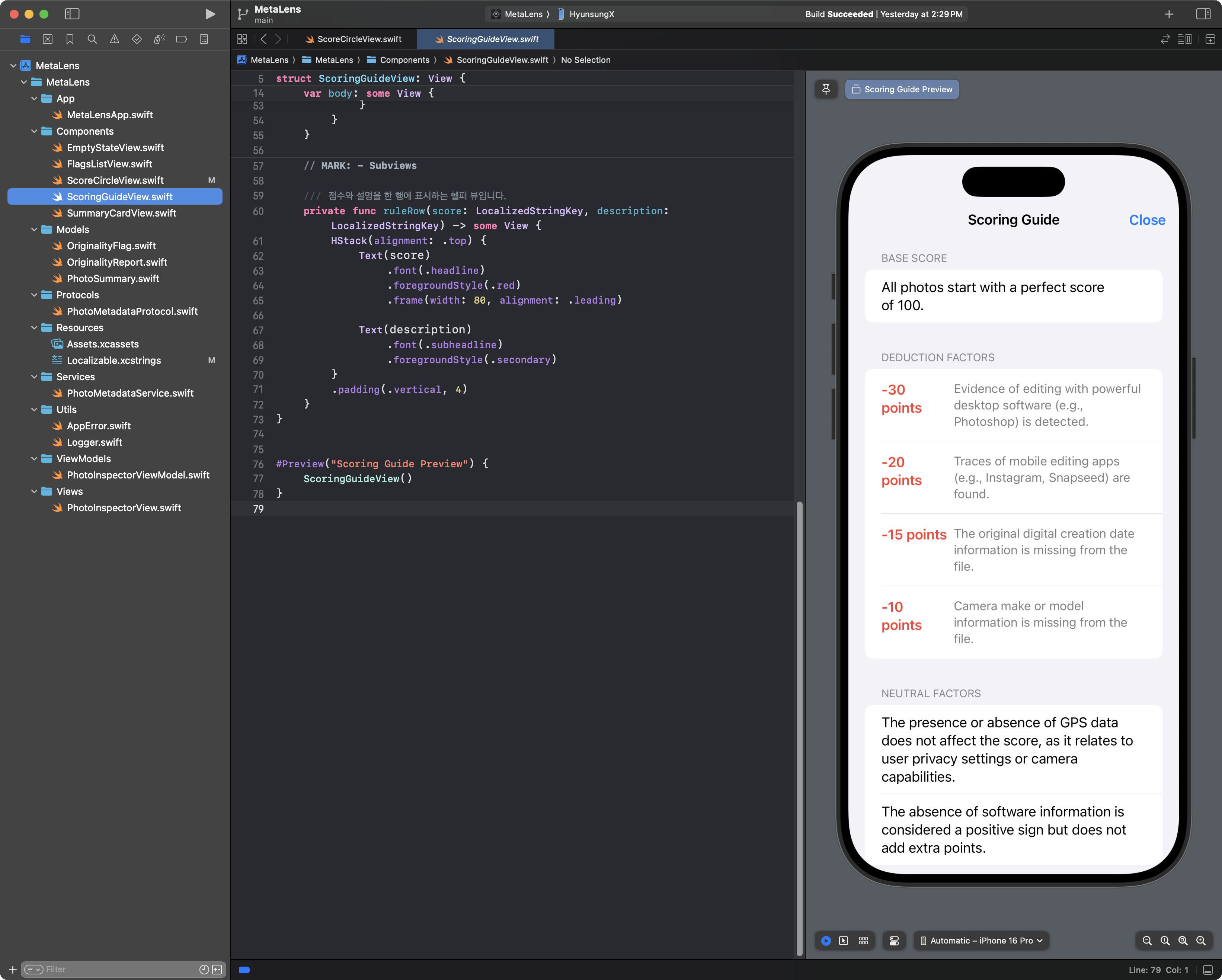 이제 잘 만들어진 '레고 블록'들을 모두 손에 쥐고 있다. 다음 포스팅에서는, 이 블록들을 조립하여 MetaLens의 최종 얼굴인 PhotoInspectorView를 완성하고, ScoringGuideView를 sheet로 띄우는 등 사용자 경험을 한 단계 끌어올리는 방법을 알아볼 것이다.