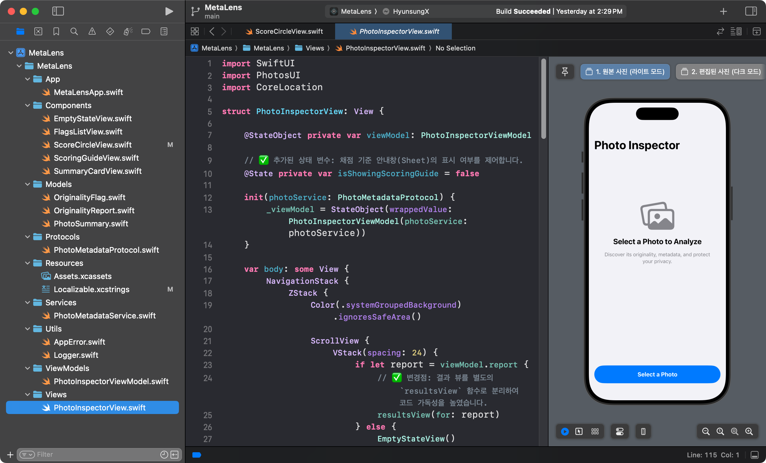 지난 포스팅 2025.09.03 - [app/metalens] - 생명을 불어넣는 작업 : 재사용 가능한 UI 컴포넌트(Components) 제작 에서 앱의 얼굴을 구성할 모든 UI 부품(Components)을 완성했다. EmptyStateView부터 ScoreCircleView, SummaryCardView 까지, 각자 하나의 책임만을 다하는 잘 만들어진 '레고 블록'들이다. 이제 남은 작업은 이 블록들을 PhotoInspectorView 라는 큰 판위에 조립하여 하나의 완성된 화면을 만드는 것이다.