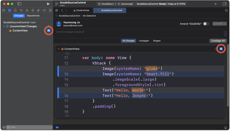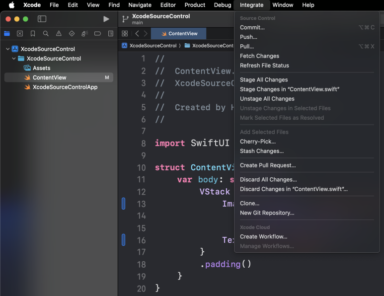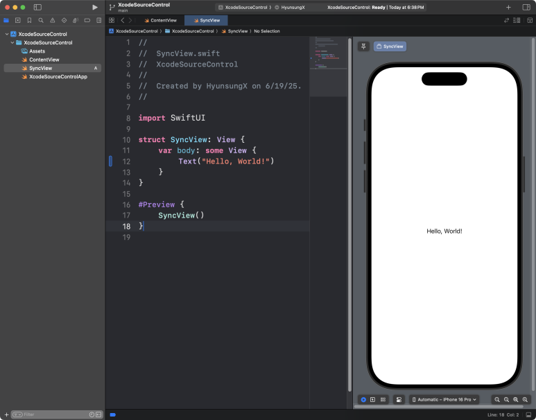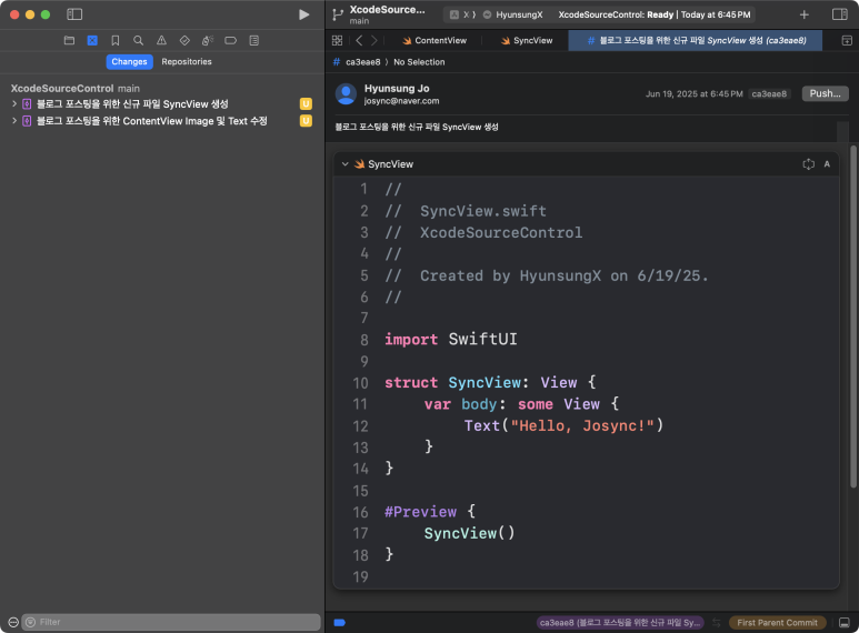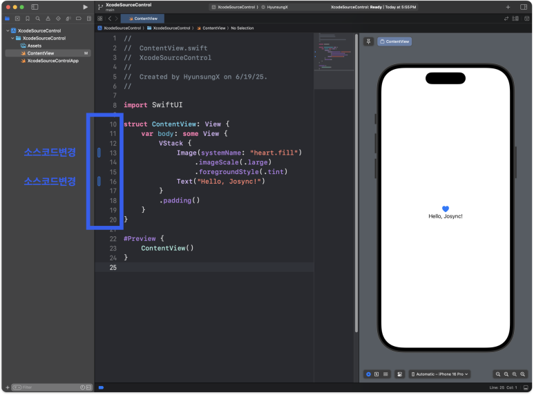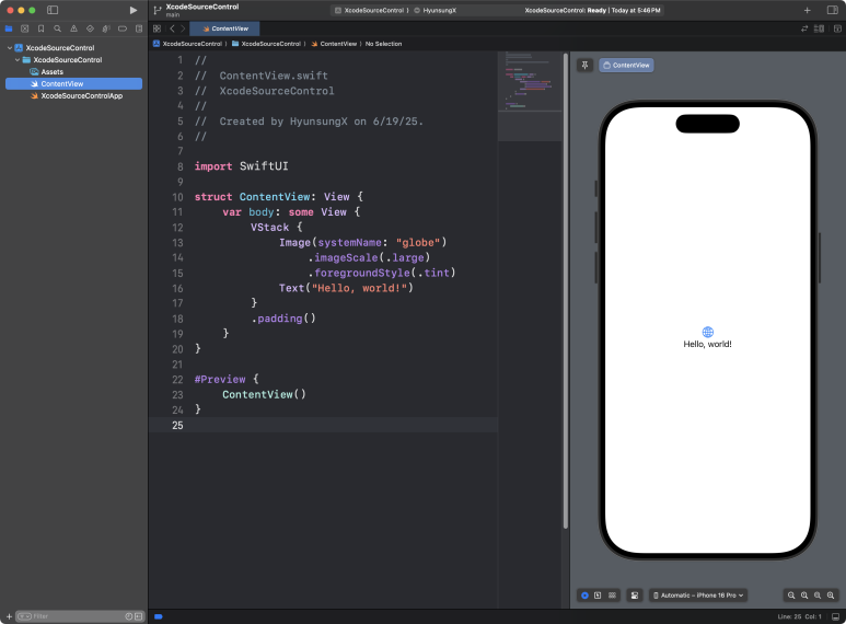 현재 Xcode의 상태는 프로젝트를 생성한 직후여서 ContentView.swift 파일과 XcodeSourceControlApp.swift 파일만 존재하는 상태다.