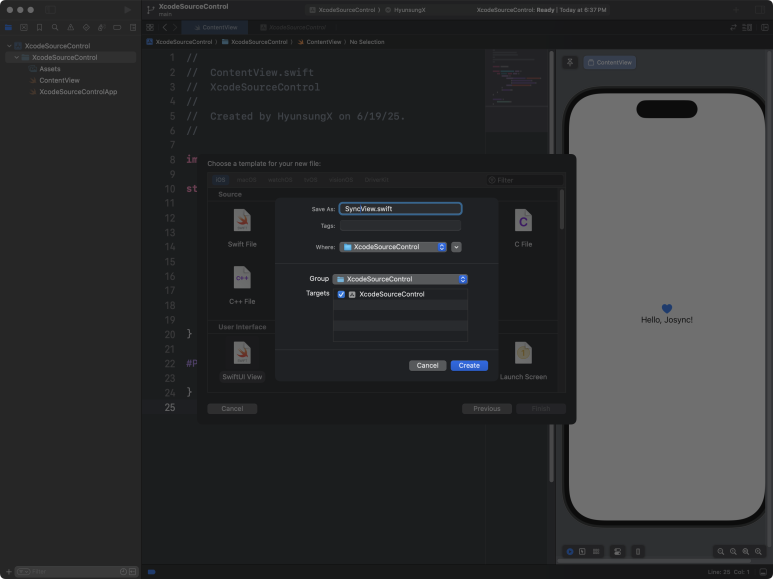 이제 다시 프로젝트네비게이터로 돌아와서, 새로운 SwiftUI파일인 SyncView.swift를 생성한다.