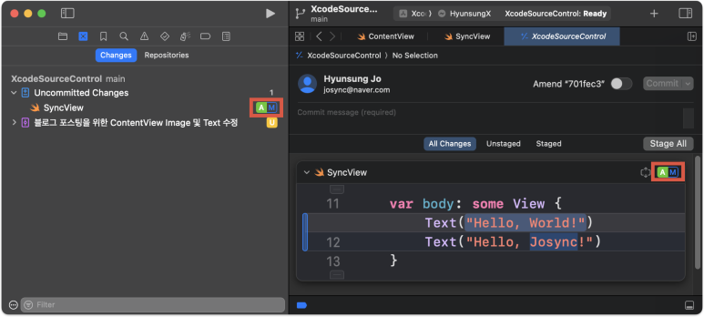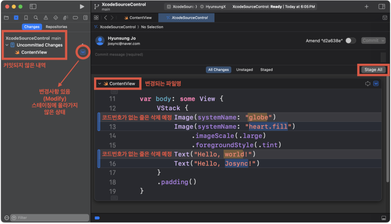 커밋 하기전, [Stage All] 버튼을 눌러 모든 변경사항을 '스테이징'에 올려야(또는 넣어야) 한다. 변경사항이 스테이징 상태에 있어야만 커밋을 할 수 있기 때문이다. (스테이징은 별도 포스팅으로 다룰 예정이다) 우선 [Stage All] 버튼을 누르면 화면이 어떻게 변하는지 주시해 보자.