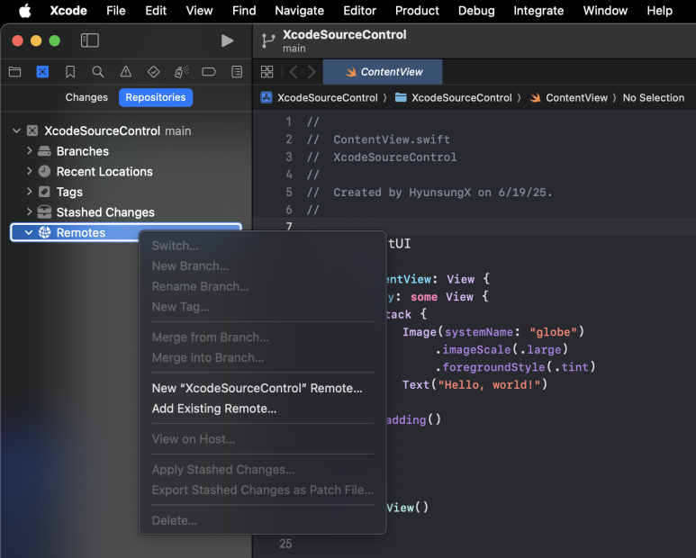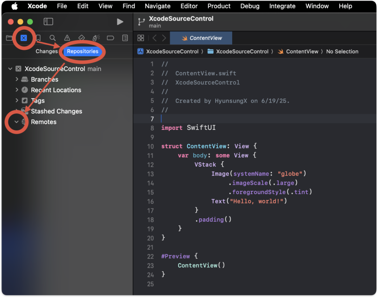 Xcode에서 원격저장소 설정도 아직 진행되지 않았다. 프로젝트 네비게이터 바로 오른쪽, 소스코드 컨트롤 네비게이터가 있다. 이것을 누른 후 [Repositories]를 선택 하고 [Remotes]를 확장 시켜 보면 원격 저장소가 없은 것을 확인 할 수 있다.