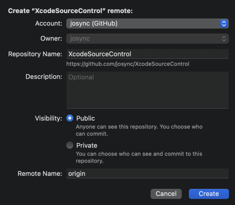 이제 [Create] 버튼을 눌러서 원격저장소를 생성해 보면, 아래 그림과 같이 원격저장소를 지칭하는 'origin'이 있는 것을 확인 할 수 있다. 여기서 (origin은 위 그림에서 https://github.com/josync/XcodeSourceControl 을 지칭한다.)