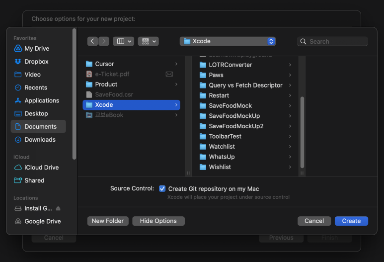 이제 프로젝트를 생성 할 로컬 경로를 선택하게 되는데, 아래 그림과 같이 [Create Git repository on my Mac] 항목이 체크되어 있는지 확인 한다. (체크가 안되어 있다면 반드시 체크, Documents > Xocde > 프로젝트 경로에 생성함)