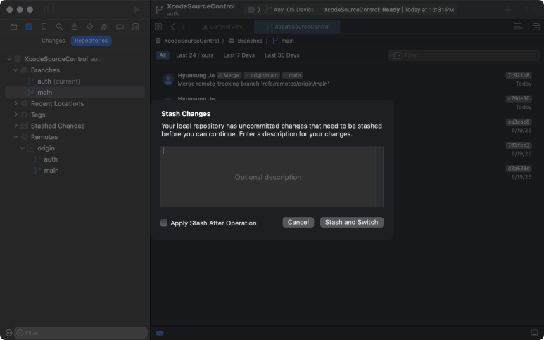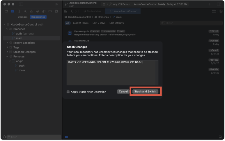 갑자기 다른 사람에게 앱을 보여주게 되었다. main 브랜치로 전환(Switch)을 시도 하면 Stash 화면을 만나게 된다.