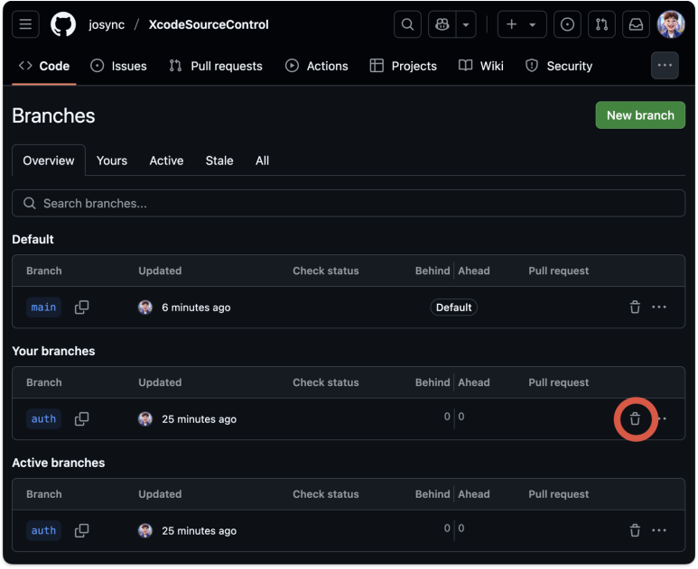 GitHub를 접속해 원격저장소 입장에서도 auth 브랜치를 삭제 진행 한다.