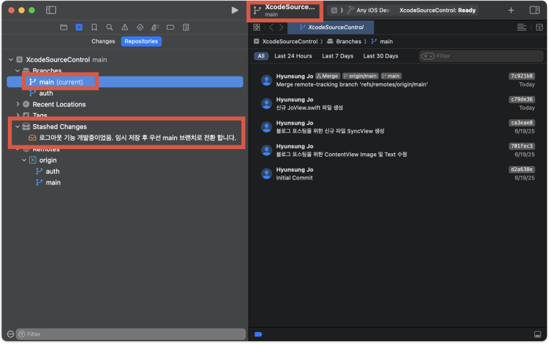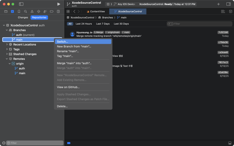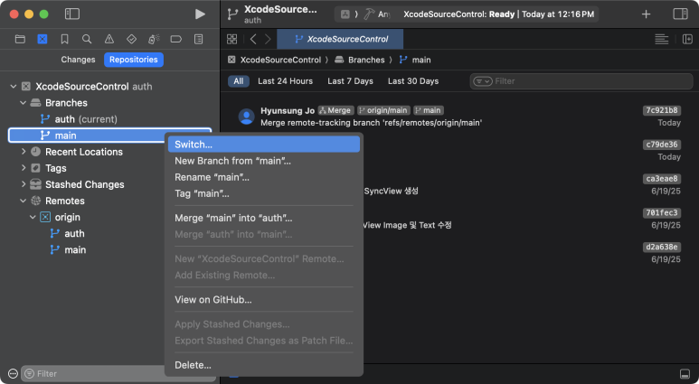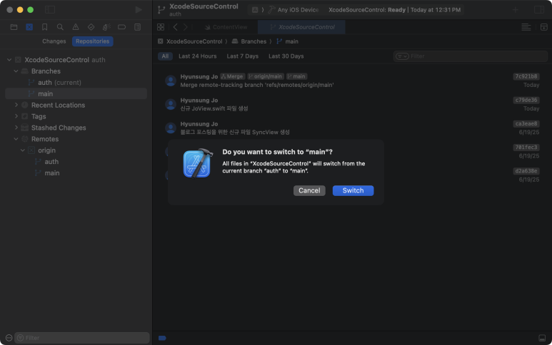 이제 Xcode로 돌아와서 main브랜치로 전환(Switch = Checkout) 해본다.