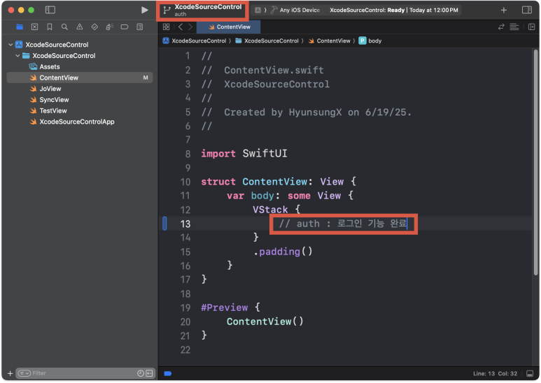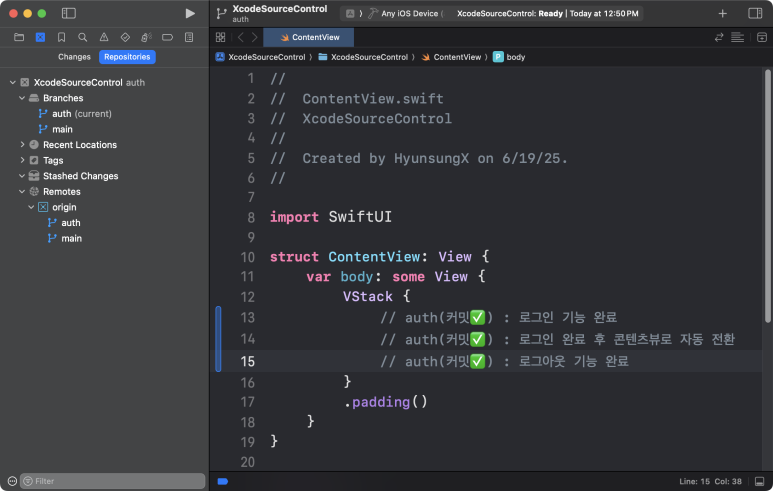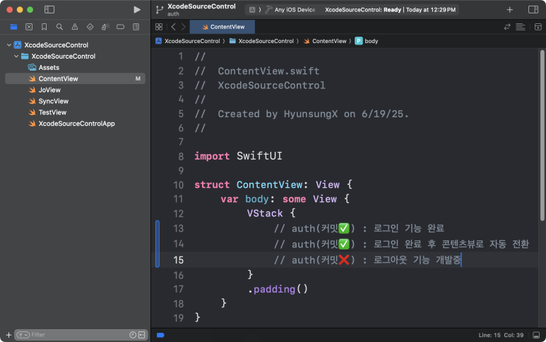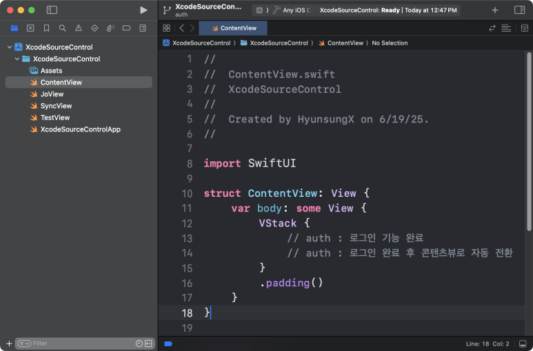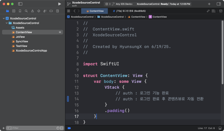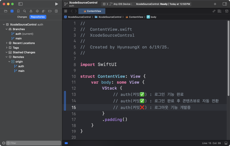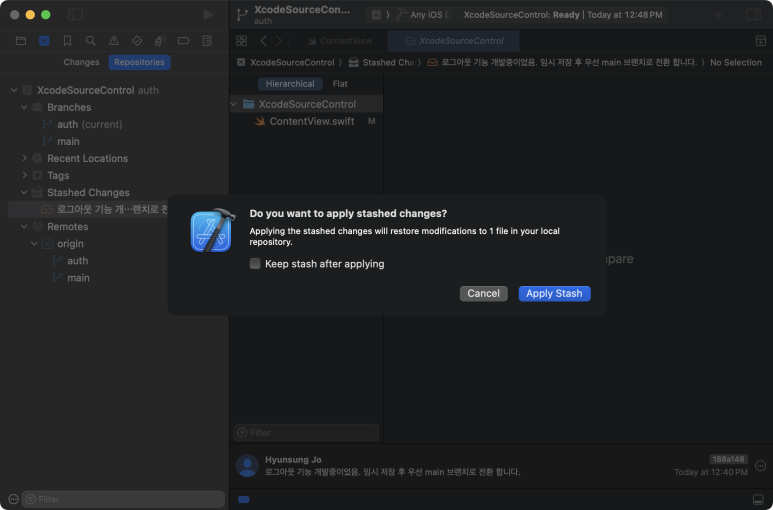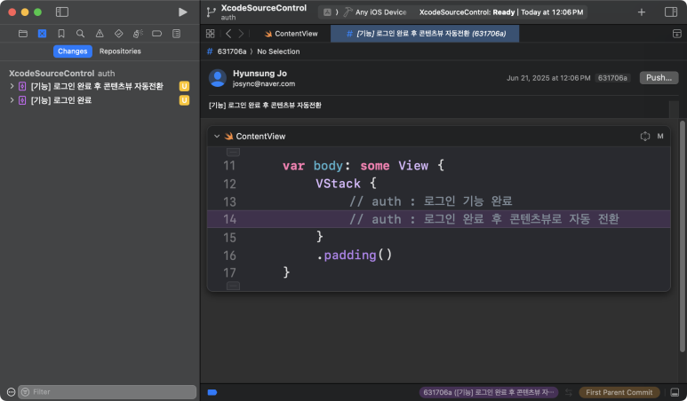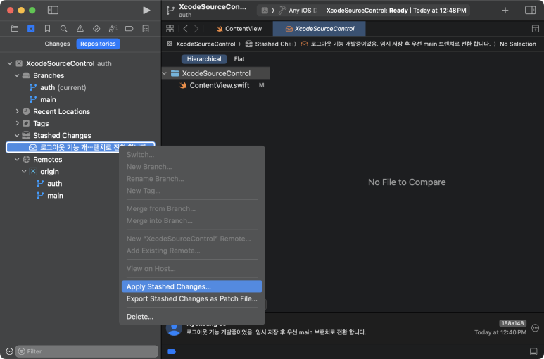 (current) 표시로 main 브랜치를 사용중 이라는 것이 확실하고, Stashed Changes 항목에 임시 저장한 변경사항도 존재 하는 것을 확인 할 수 있다. ContentView.swift 파일을 확인해 봐도 auth브랜치에서 작업한 내용들이 반영되어 있지 않고, main에서 커밋했던 마지막 소스코드로 복원 되었다.