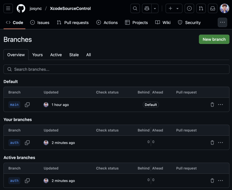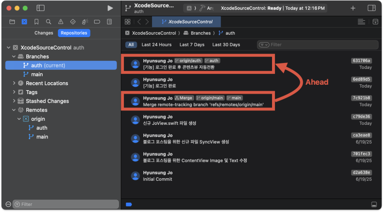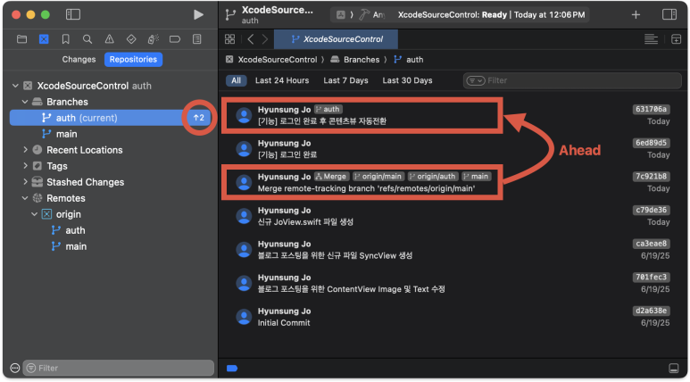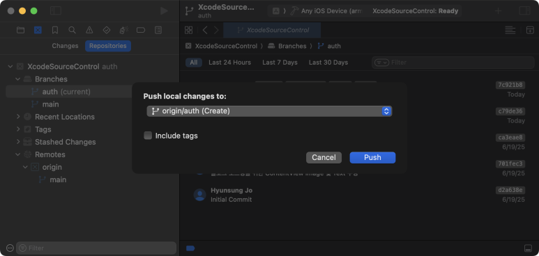 Xcode에서도 원격저장소를 지칭하는 origin을 확인해 보면 main 브랜치만 존재하는 상태이다. 즉, 새로 생성한 auth 브런치는 아직까지 '로컬전용' 브랜치 라는 것이다.