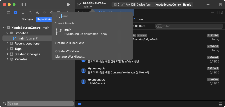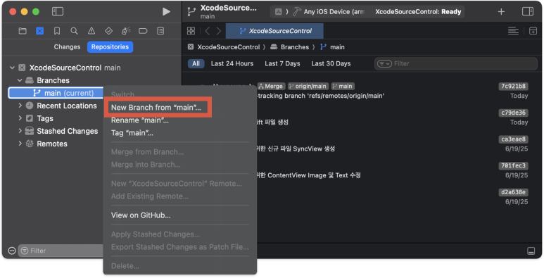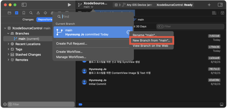 Xcode에서 현재 상태를 확인해 보면 'main' 브랜치만 존재 한다. main 브랜치의 우측 점3개 버튼을 눌러서 New Branch form "main"으로 새로운 브런치를 만들 수도 있고,