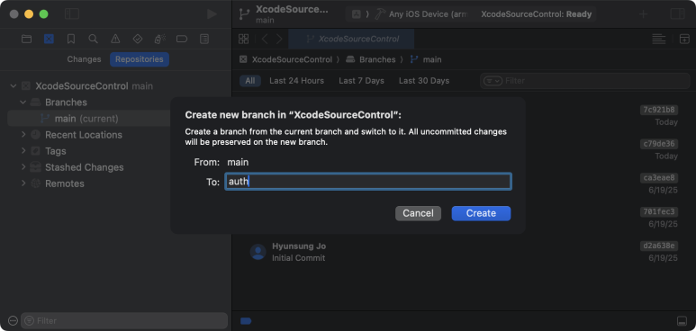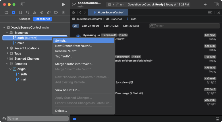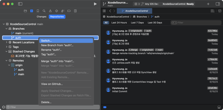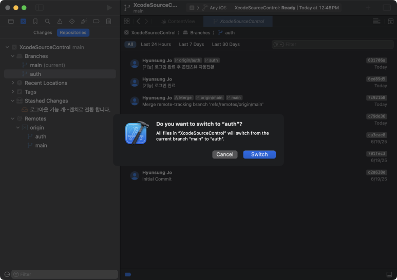 만약 새로운 브랜치를 생성 했음에도 Xcode가 새로운 브랜치로 이동시켜주지 않으면, Switch 버튼을 눌러 전환(Checkout) 시켜주면 된다.