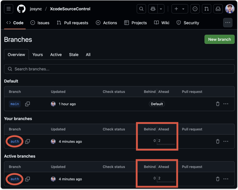 이것을 GitHub에서 확인해 보면, main브랜치보다 auth브랜치가 2커밋 앞서있다고 명확히 표시해 준다.