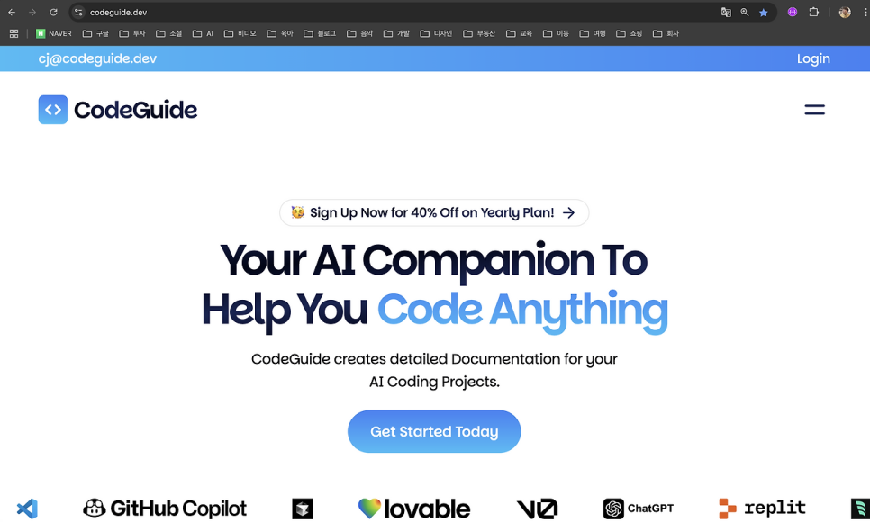 잠 못 드는 새벽에 링크드인에서 알림이 울려 읽어 봤는데 프로그래밍 실력을 높이기보다는 코드가이드데브(codeguide.dev)에 글을 더 깊게 작성하는 연습을 하는 것이 앞으로 좋을 것 같다는 포스팅을 봤다. 궁금증에 다음날 눈을 뜨자마자 코드가이드데브에 접속했다.