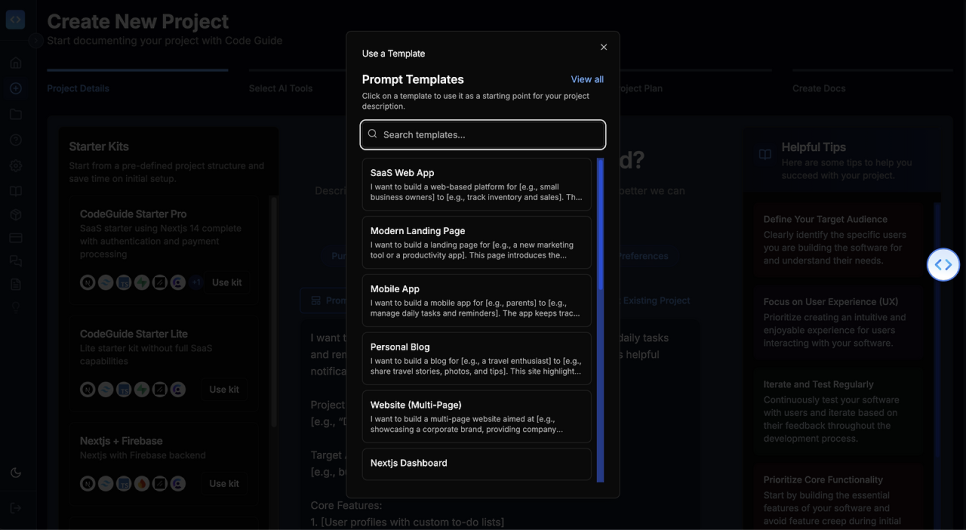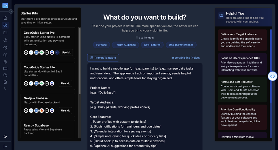 방식은 간단하다. 코드가이드데브에 만들고 싶은 앱의 내용을 적어 넣으면, 그것을 기반으로 AI가 여러 질문을 하게 된다. 또 그 질문은 코드가이드데브가 AI로 답변해 주거나 사용자가 수동으로 수정할 수 있다.