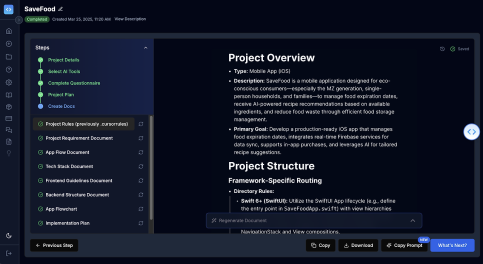 이렇게 생성된 문서들은 다운로드하거나 실시간 연동 하여 커서(Cursor)에 가져오기(Import)해서 프로젝트룰을 설정하고 바이브코딩(Vibe Coding)을 시작할 수 있다.