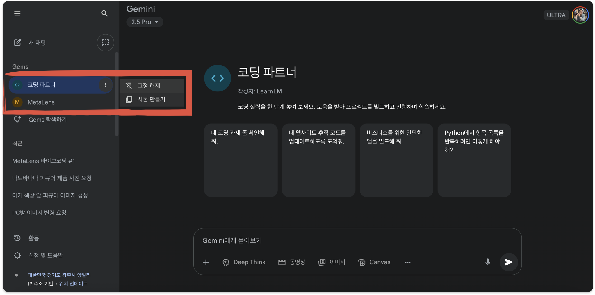 아무튼, 지금은 Gemini로 한다. ULTRA 요금제도 결제 되어 있으니 안 할 이유가 없다. Gemini에서는 "코딩 파트너", "Storybook", "브레인스토밍 도우미", "커리어 컨설턴트" 같은 기본 Gem을 제공 하고 이것을 사본으로 만들어 커스터마이징 할 수 있다.