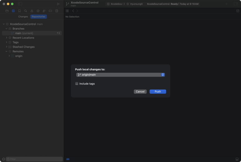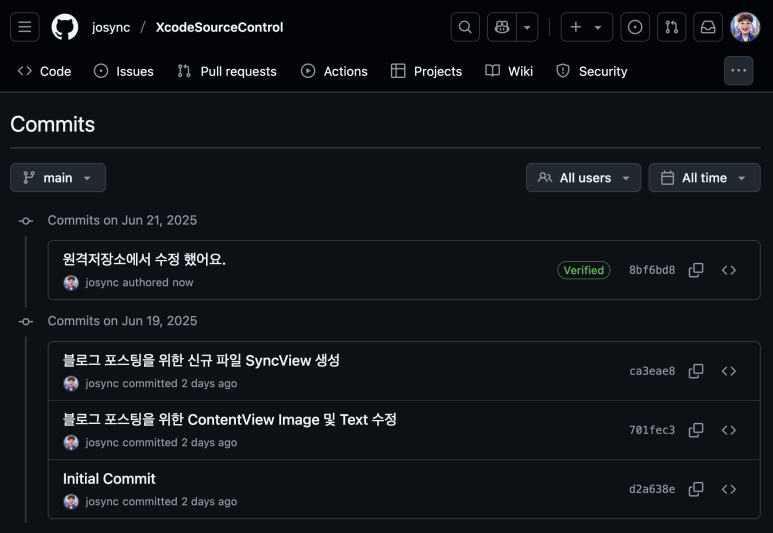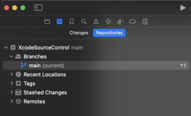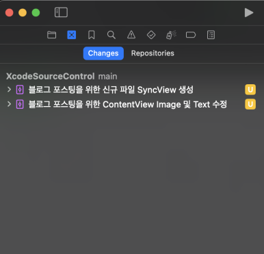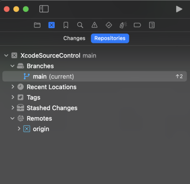 때문에 Xcode에서 원격저장소(ex:GitHub)를 설정하고 Git으로 버전 관리를 시작 했다면 커밋과 함께 가장 먼저 마추지는 기능들이다. 지난 포스팅(Xcode에서 소스코드 커밋하기)에서 원격저장소인 GitHub를 다루지 않고, 로컬 상태에서 2개의 커밋(변경사항)을 만들었었다.