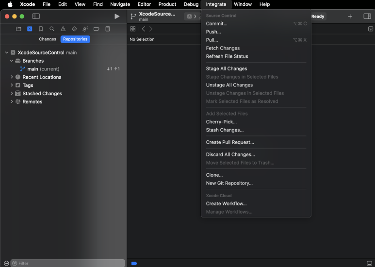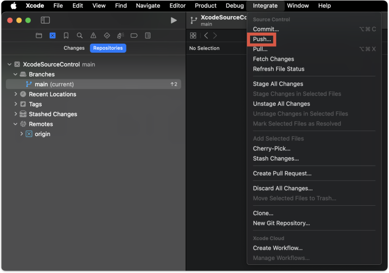 Xcode의 Integrate 메뉴에서 Push를 찾을 수 있다.
