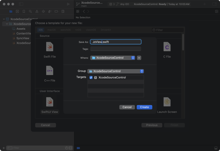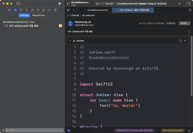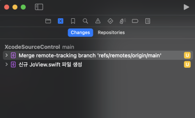 원격저장소에서 변경사항이 있음을 모른채 작업을 한다고 가정해 보자. JoView.swift 라는 SwiftUIView 파일을 신규로 생성 했다.