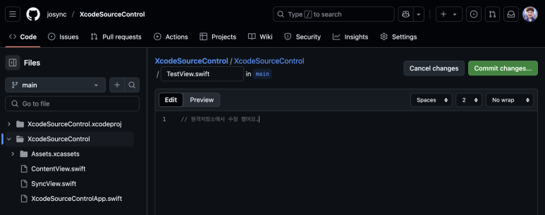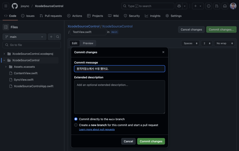 TestView.swift 라는, "원격저장소에서 수정 했어요." 라는 주석만 있는 파일을 만들고 Commit changes 버튼을 누르면 커밋메시지를 입력 하고 저장 할 수 있다.
