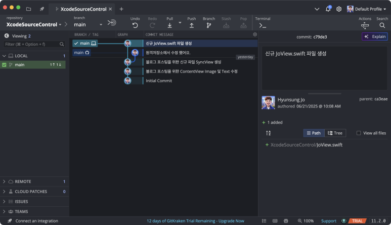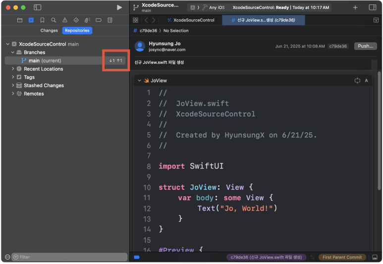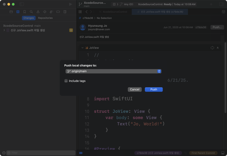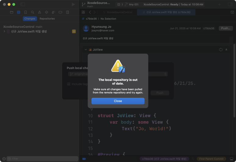 이제 Push할 항목은 본래 목적이었던 로컬에서 생성한 JoView.swift 파일 생성한 변경사항과, 원격저장소로 부터 병합받은 변경사항 총 2가지 이다. 이제 Push 할 수 있다.
