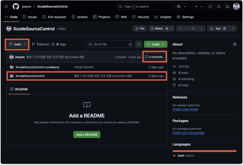 Initial Commit 이라는 것이 존재하는데, Xcode에서 원격저장소 만들기를 할 때 최초 커밋으로 1번 커밋이 진행된 후 원격저장소가 생성된 것이다. 그렇기 때문에 우리가 진행한 총 커밋은 3개가 맞다. 이로서 로컬에서 내가 만든 변경사항은 Push를 통해 모두 원격저장소에 반영되었다.