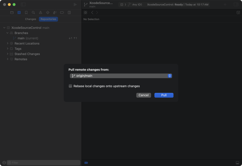 다시 Xcode의 소스컨트롤네비게이터에서 Repositories 탭을 주목해 보자. Push 할 항목도 존재 하지만, Pull 할 항몯고 존재 한다.