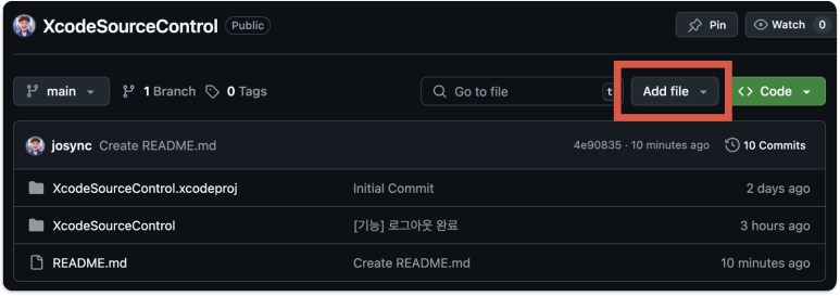 README 파일을 GitHub웹페이지에서 만든김에 .gitignore 파일도 GitHub웹페이지에서 만들어 보도록 하겠다. Add file 버튼을 눌러보자.