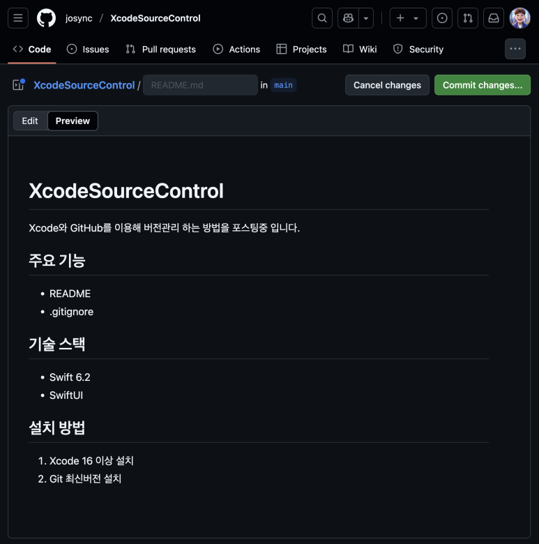 마크다운으로 README.md 파일을 작성 완료 했다면, 우측 상단의 Commit changes 버튼을 눌러 main 브랜치에 커밋 시킨다.
