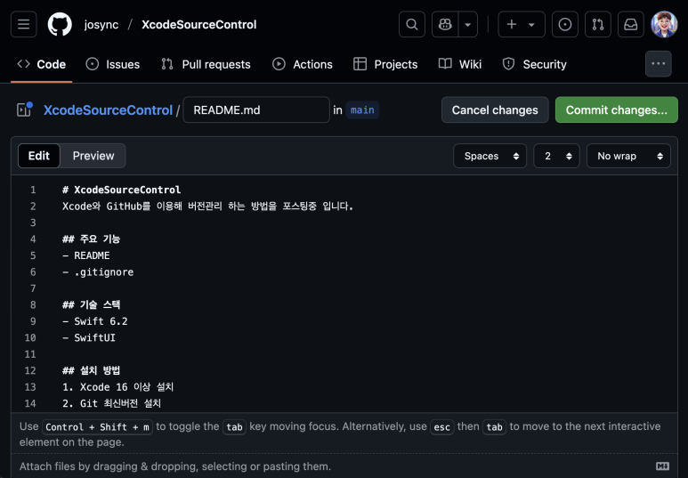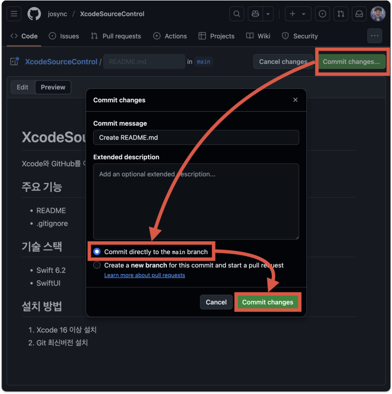 마크다운으로 README.md 파일을 작성 완료 했다면, 우측 상단의 Commit changes 버튼을 눌러 main 브랜치에 커밋 시킨다.