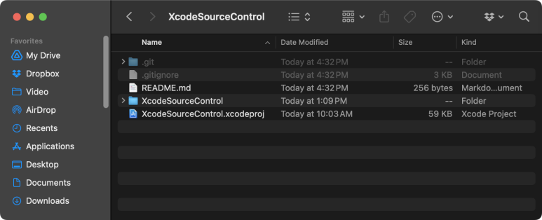 방금 추가된 README.md 파일과 .gitignore 파일이 Xcode의 프로젝트 네비게이터 상에는 보이지 않을 수 있다. 파인더로 이동하여 숨김 파일을 표시하는 [Command] + [Shift] + [.(마침표)] 단축키를 입력하면 아래와 같이 파일을 확인 할 수 있다.