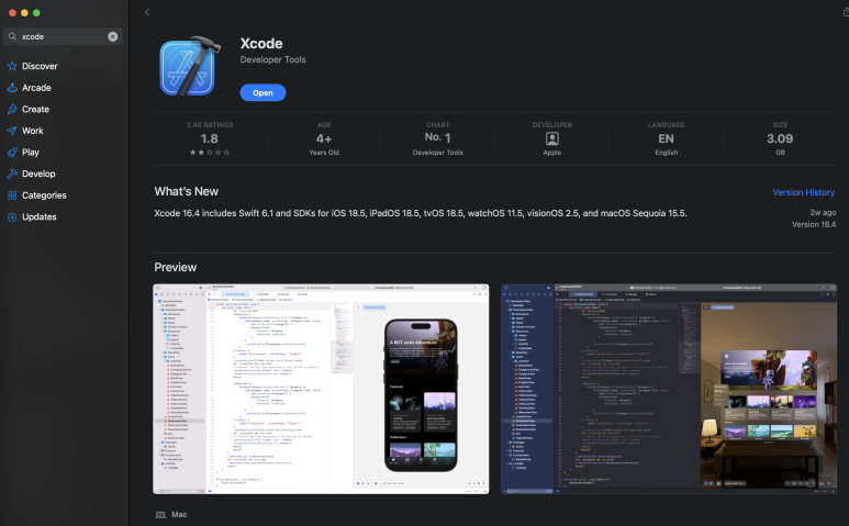 Xcode는 iOS 앱 개발을 위한 필수 도구다. Mac App Store 에서 Xcode를 검색 한 후 설치를 해보자. (용량이 크므로 최소 40~50GB를 확보해 두어야 한다)