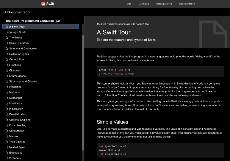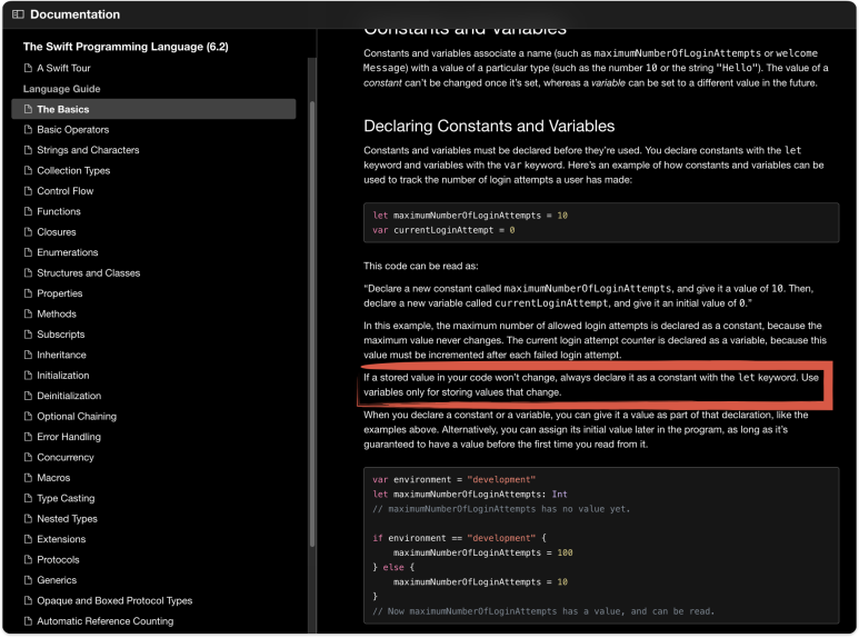 Swift를 처음 배울 때 가장 먼저 만나는 문법 중 하나는 바로 변수(var) 와 상수(let) 이다. 스위프트의 공식 문서를 확인해 보아도 좌측 최상단 메뉴의 A Swift Tour 와 The Basics 메뉴에서는 이 변수(var)와 상수(let)로 시작 한다.